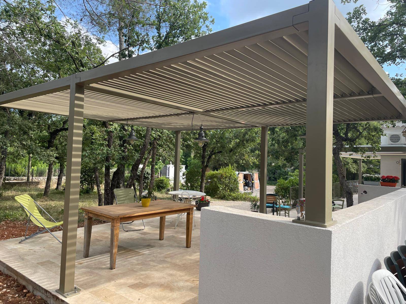 Contrairement aux modèles bioclimatiques motorisés, cette pergola à lames fixes est le fruit d’une conception intelligente : les lames sont réalisées en tôle aluminium pliée, avec aux extrémités des platines en découpe laser soudées, permettant un assemblage précis et discret à la structure acier.